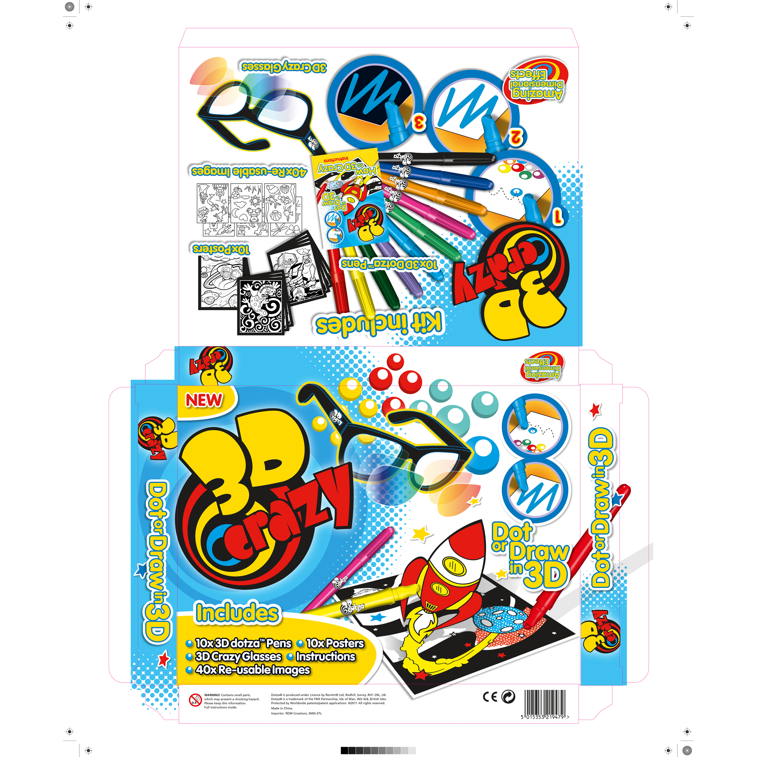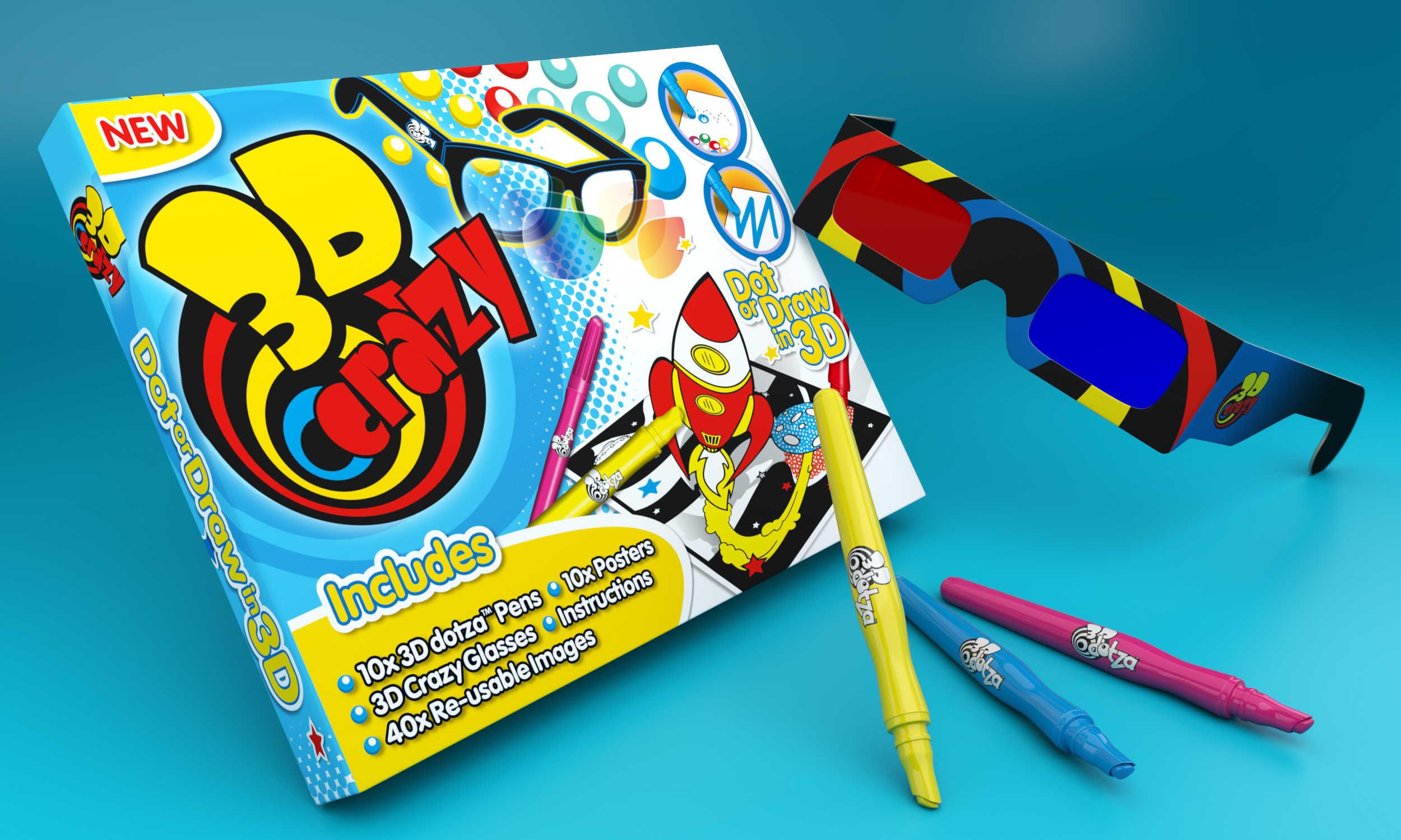 3D Crazy pens are unique! Overlaying light colours on top of dark or lay contrasting colours side-by-side, creating visual effects when viewed through special glasses turn 2D drawing 3D. Was invited to help bring this unique product to market through the creation of a bespoke brand and accompanying packaging, designed to appeal to a younger target audience conveying the unique vibrant qualities of the pens.