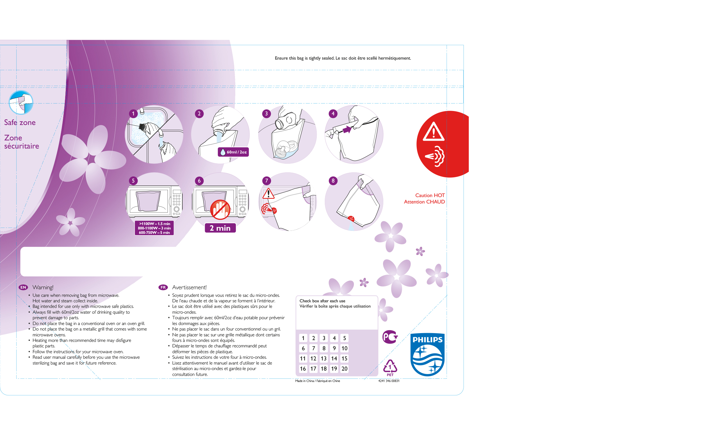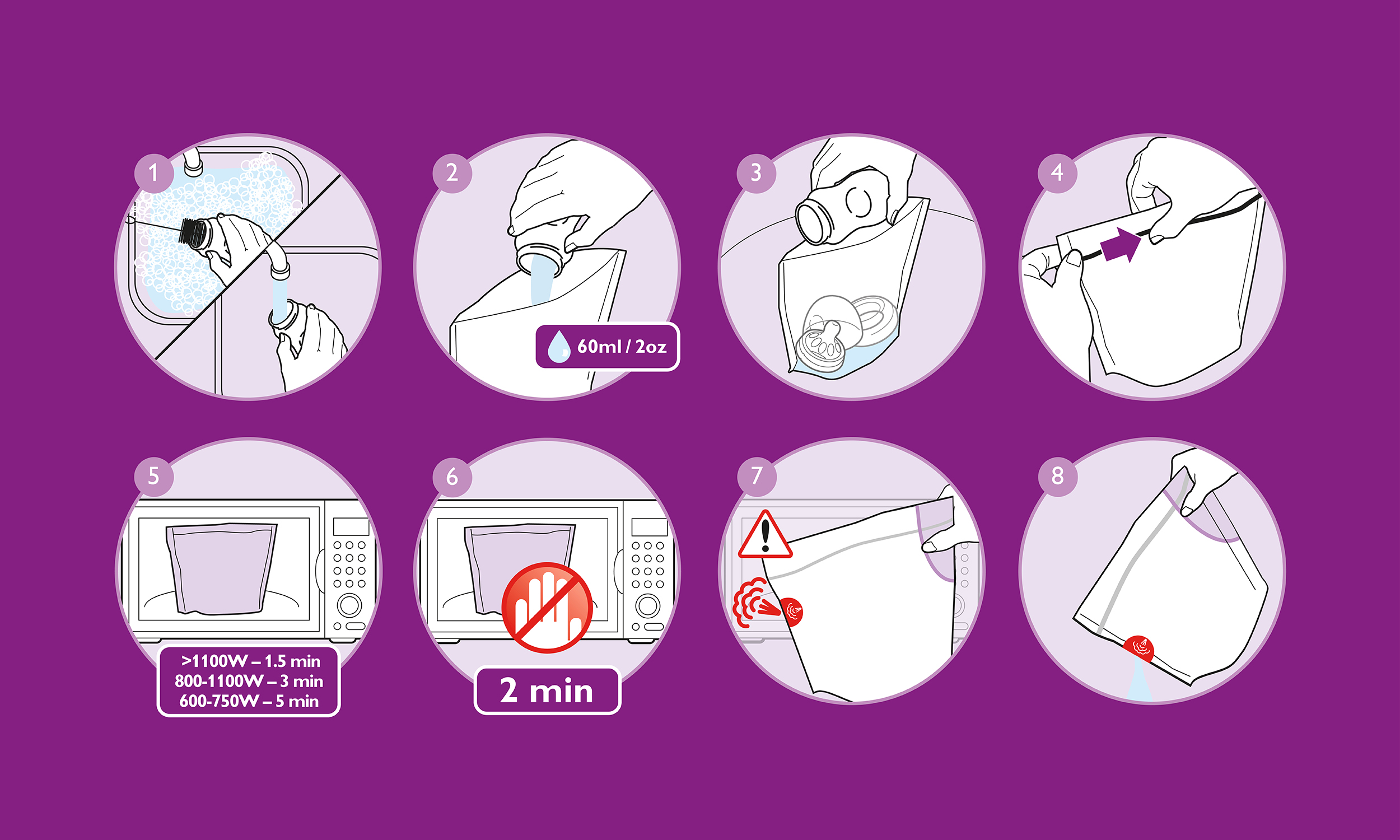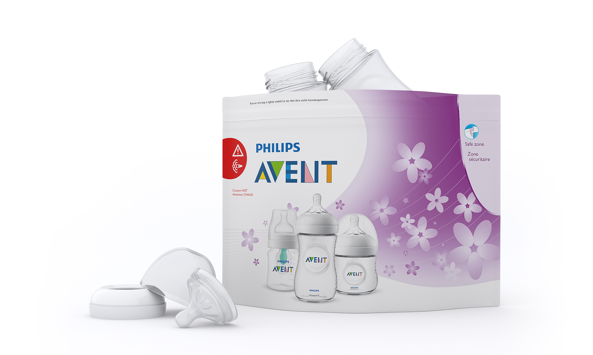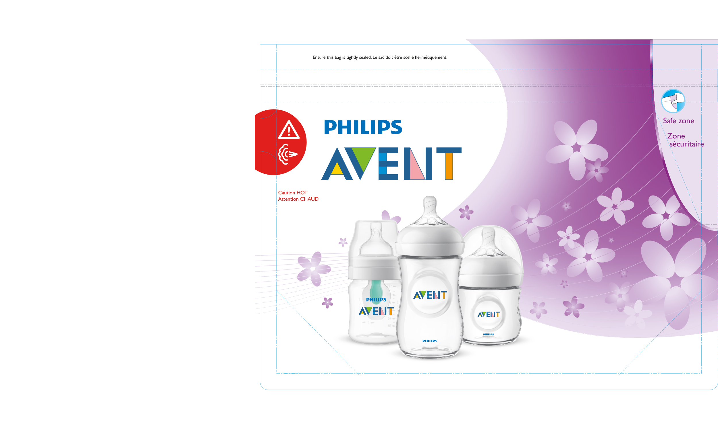 Appointed by Philips to deliver a packaging design solution for their new microwave steriliser bags. Using the unique petal shape design on the bottle teats as inspiration went on the create a flower shape icon. As a metaphor for natural, innocence and purity created a floral texture in combination with radiating lines, symbolic of microwave energy. Both of these elements were merged with a purple gradient to culminate in an attractive looking design to visually communicated a convenient modern-day sterilising process.