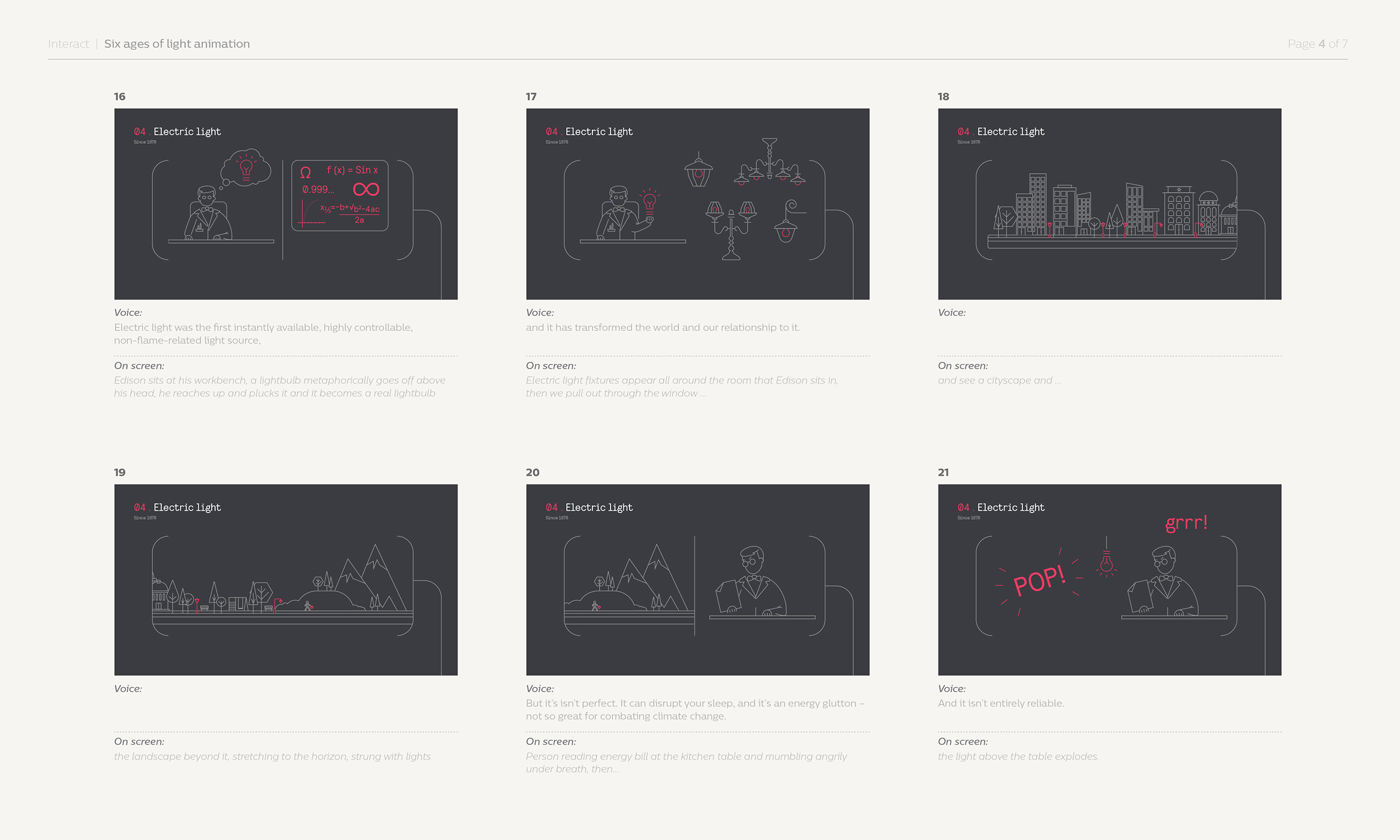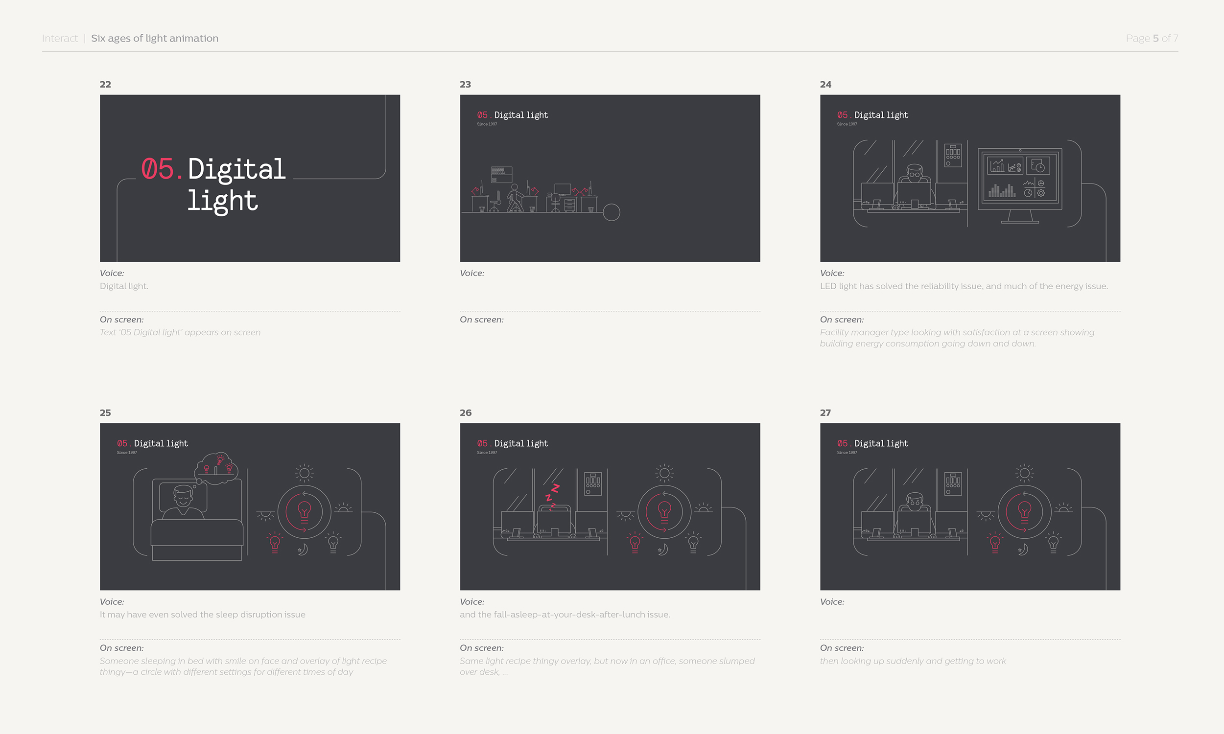 Through iconography and illustration, I created a series of short animated sequences to help explain the history of light. The final scene focused on how connected lighting can collect data via sensors in the lighting systems, data applications to analyse and gain new insights. This information then helps operators and customers to improve ways of working.